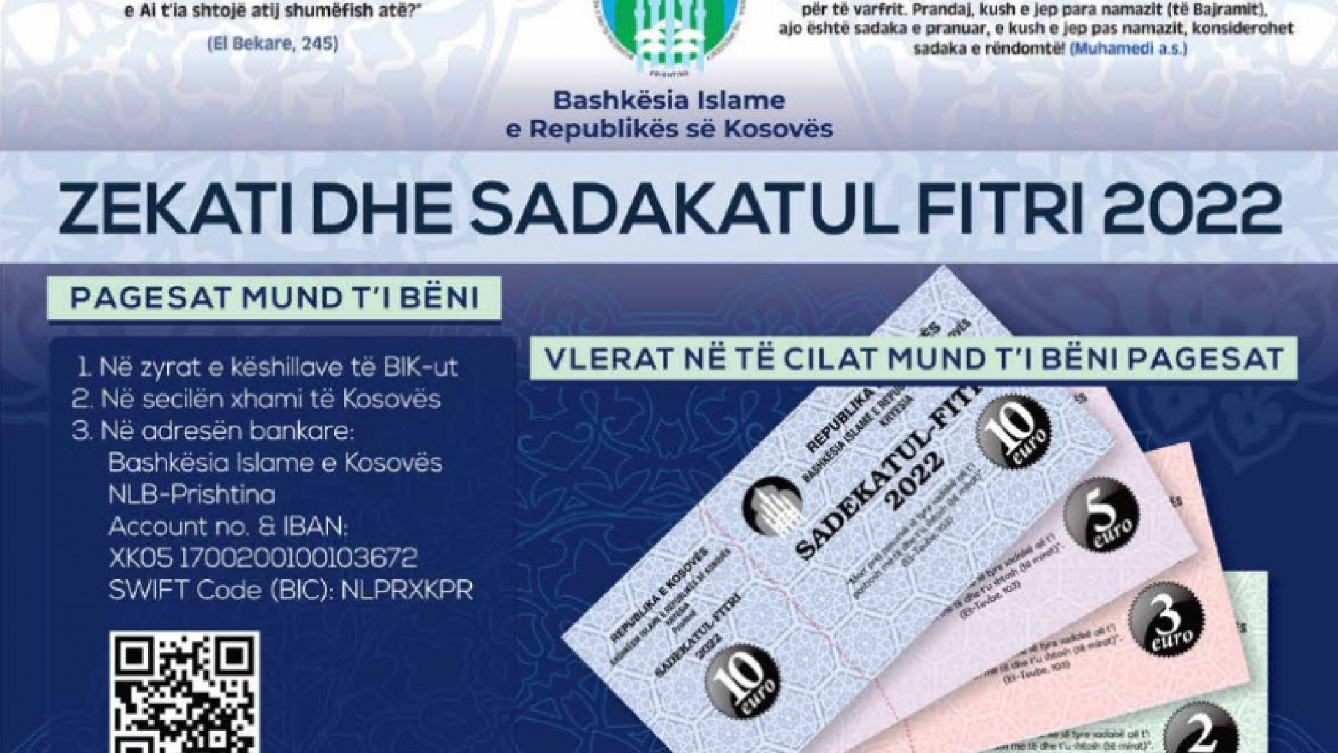 Bashkësia Islame e Republikës së Kosovës, sikurse edhe viteve të kaluara edhe këtë vit organizon tubimin e zeqatit dhe sadakatul-fitrit.