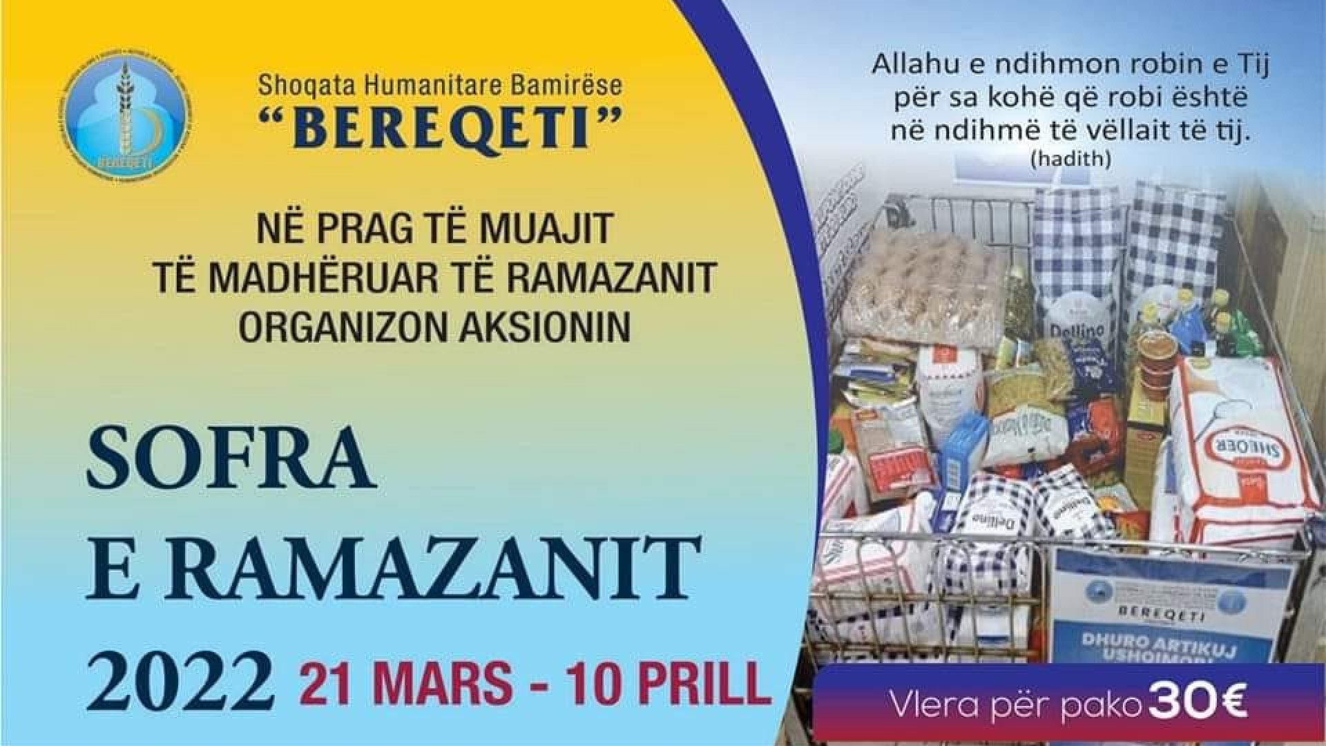 Kryesia e Bashkësisë Islame të Kosovës gjegjësisht Shoqata Humanitare Bamirëse “Bereqeti”, në prag të muajit të bekuar të Ramazanit do të organizoj aksionin “Sofra e Ramazanit 2022”