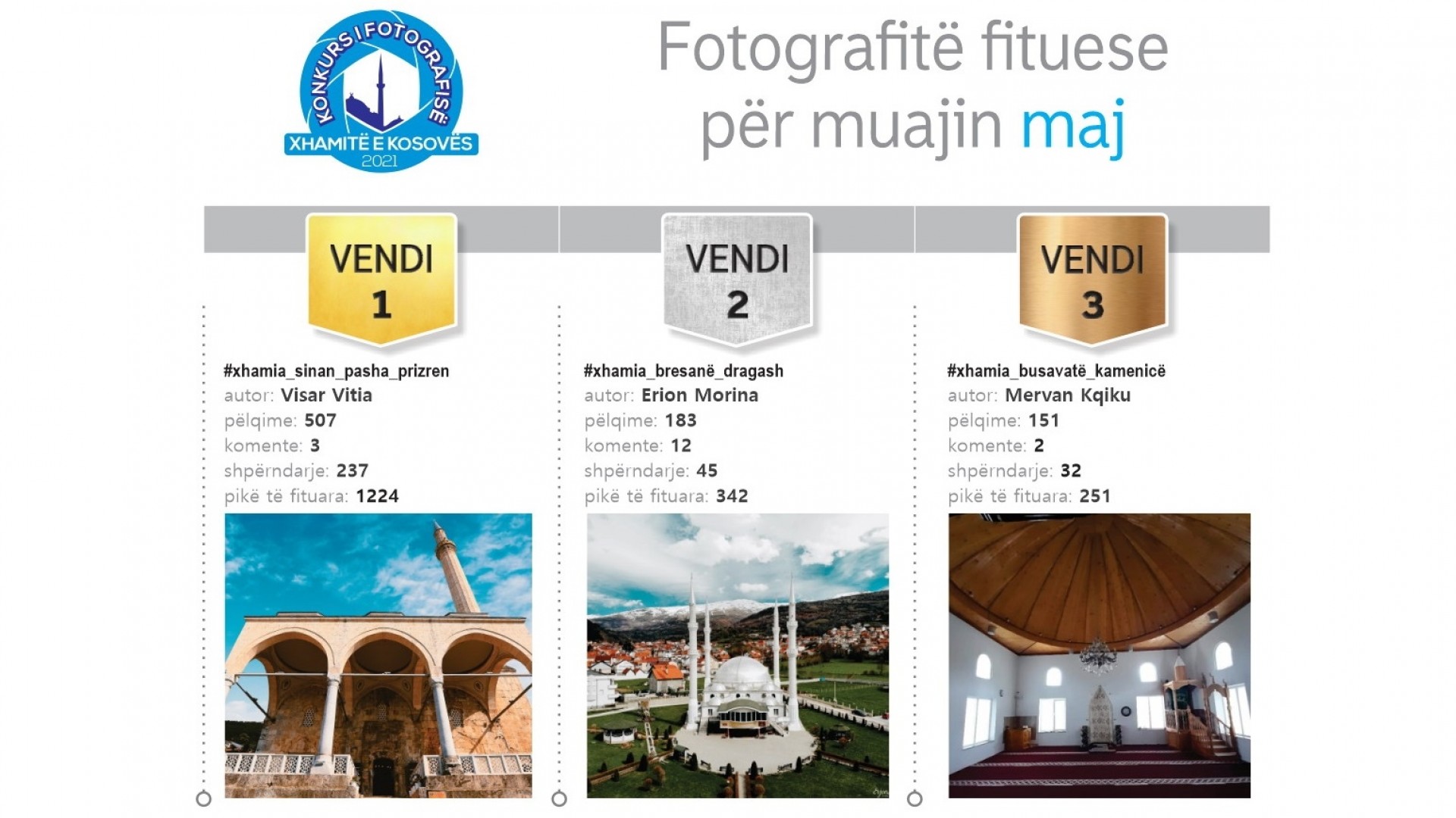Kryesia e Bashkësisë Islame të Kosovës, shpallë tre fituesit për fotografinë më të mirë të muajit maj 2021, në bazë të pëlqimeve, komenteve dhe shpërndarjeve,.
