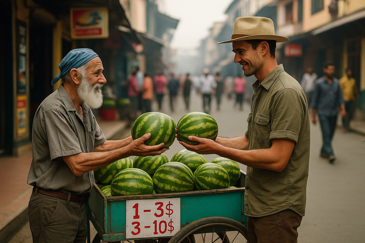 Në një skaj të rrugës qëndronte një plak i heshtur, i ulur në një stol druri, pranë një karroce të thjeshtë me shalqi të mëdhenj e të gjelbër.